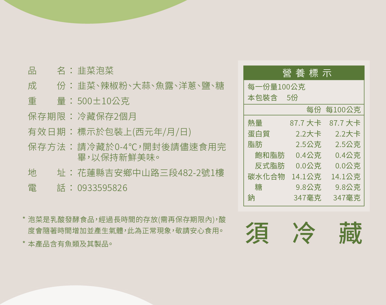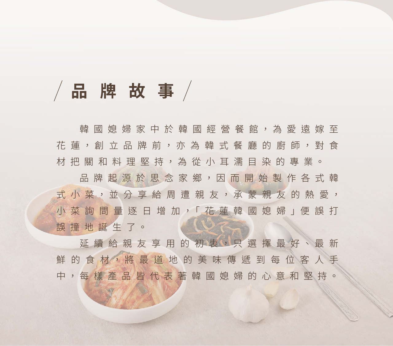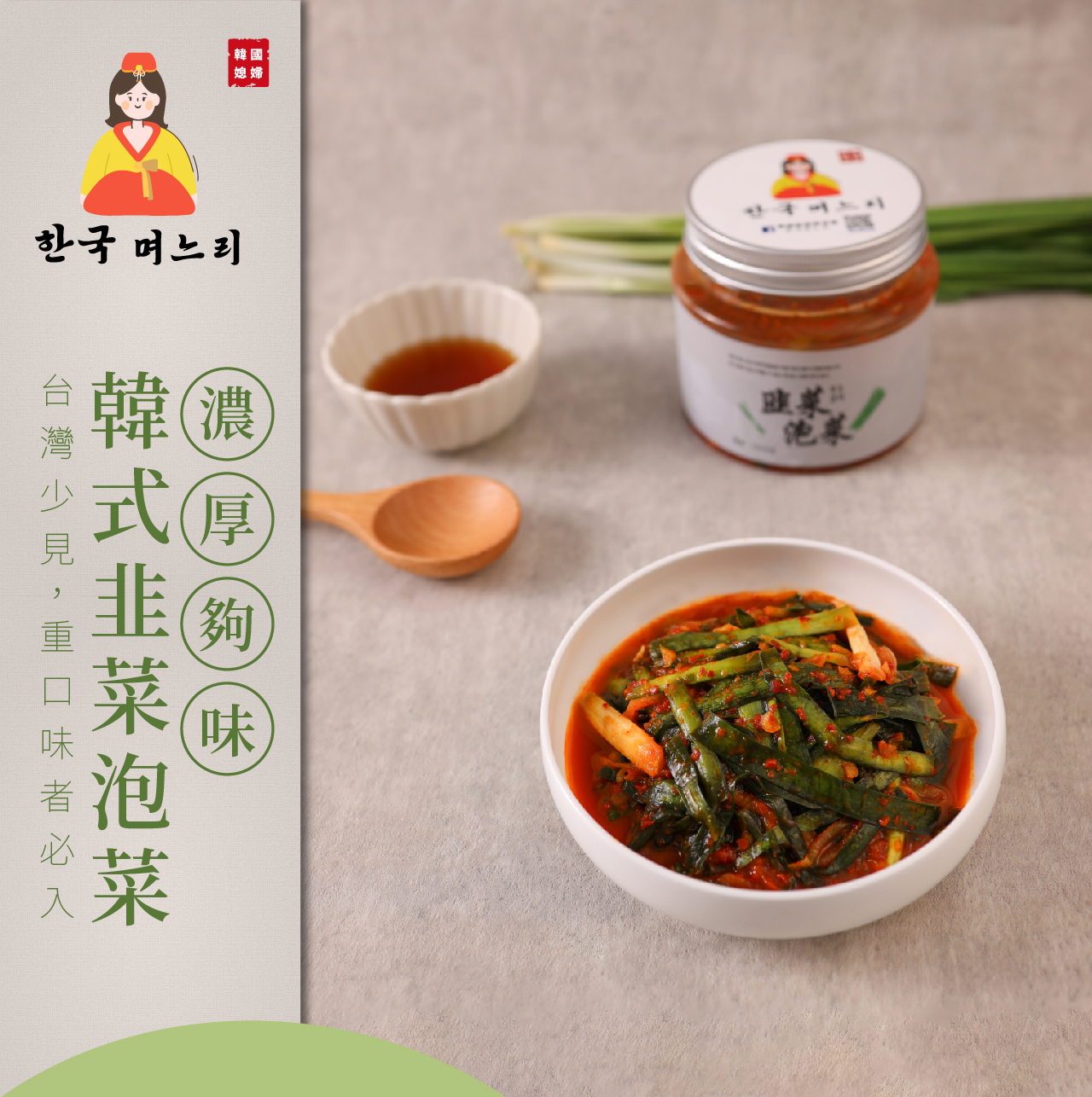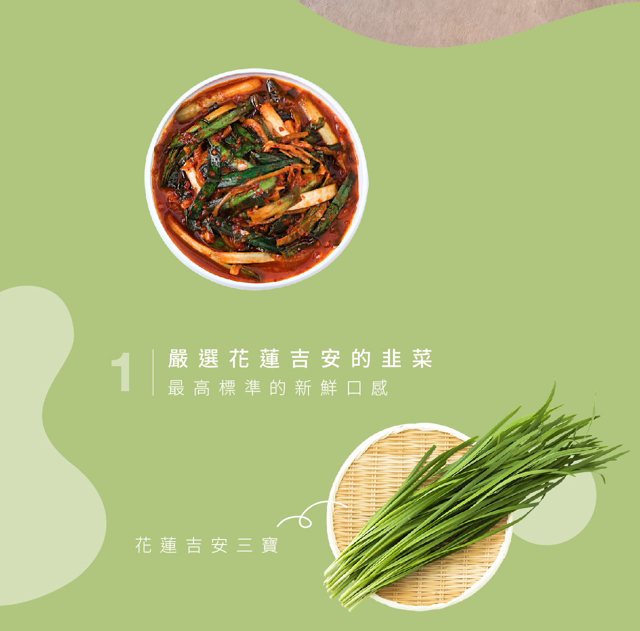 採用韓國媳婦嚴選花蓮吉安三寶之一的韭菜製作,鮮嫩韭菜結合正宗韓式調味,濃厚夠味,給你如同親臨韓國餐館的味蕾饗宴!