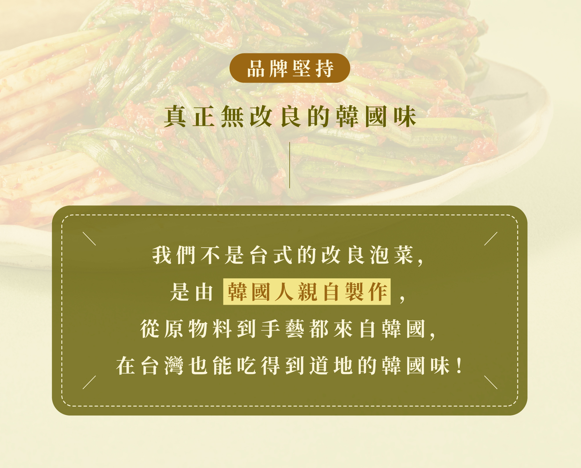 從韓劇走出來的道地小菜,嚴選品種入口溫和不嗆辣,再搭配道地作法忠實還原韓國家常味道!