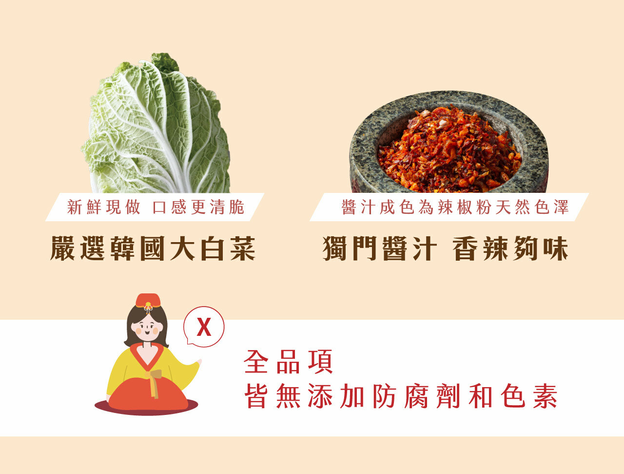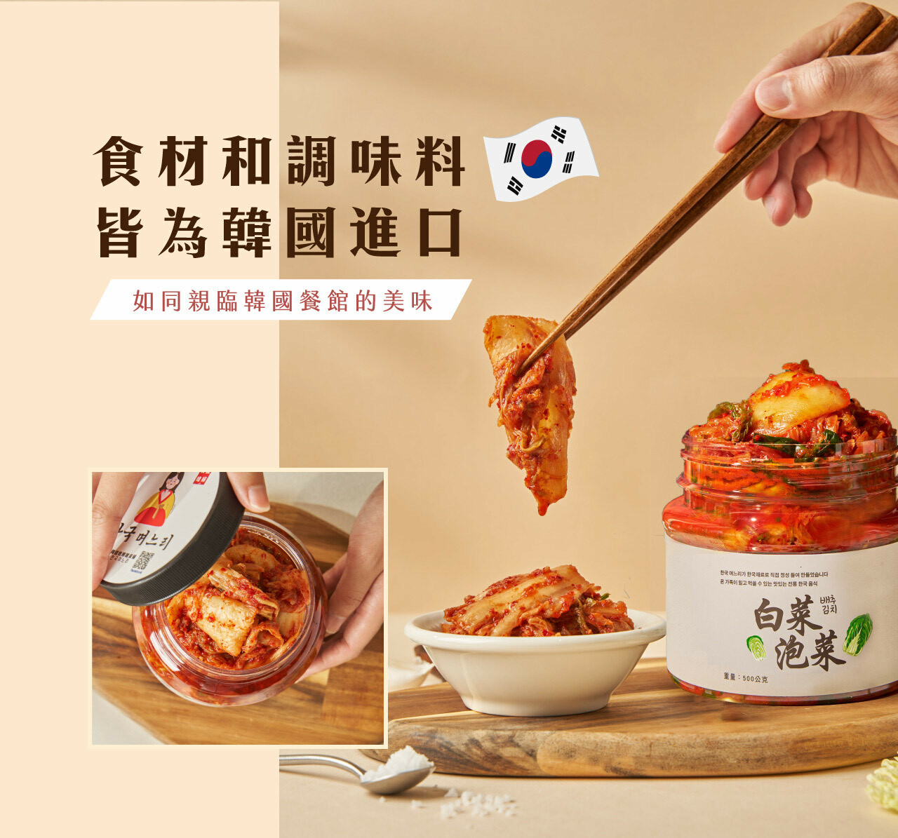 材料皆為韓國進口,選用清脆鮮甜的韓國大白菜,正宗韓式調味,不死鹹、不膩口。百搭小菜,單吃或搭配其他料理享用,怎麼搭都好吃,韓式料理愛好者務必嘗試!