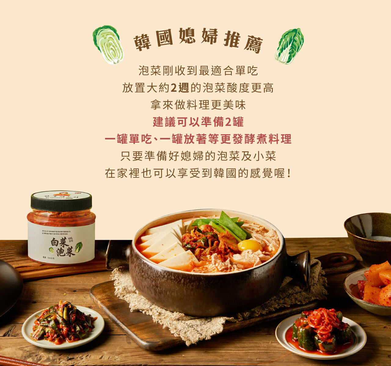 貼心提醒:泡菜為發酵食品,保存越久酸度越高為正常現象唷,酸度高的泡菜味道濃厚,更適合加入料理中!